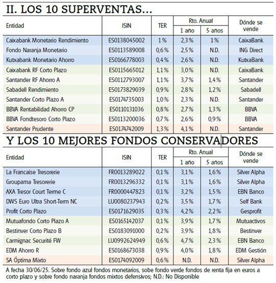 · Muchos de estos fondos conservadores, por el enorme tirón que tienen en nuestro país, son superventas que gestionan volúmenes de patrimonio por encima de la barrera de los 1.000 millones de euros. Fondos que, como no podía ser de otra manera, son buques insignia de los grandes bancos a los que los ahorradores acuden confiados. En general, no son las mejores alternativas a su alcance, pues son más caros, están peor gestionados y, a la postre, son menos rentables que otras opciones menos “populares”. De ahí que no destaquen precisamente por su valoración en nuestro sistema de calificación. Es cierto que, debido al escaso riesgo que conllevan, las diferencias de rentabilidad aquí respecto a las mejores opciones tampoco van a ser nada del otro mundo. Pero ¿por qué renunciar a unas décimas extra de rentabilidad que en realidad le corresponden? Nuestro consejo es claro. Evite los superventas y trate de dar con el fondo conservador que mejor se adapte a sus necesidades. Le ayudamos a encontrarlo.