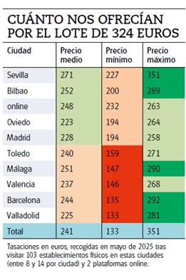 A todos ellos acudimos con un lote de cuatro piezas modestas: dos anillos y unos pendientes de 18 k y una pequeña pulsera infantil de 9 k. El peso total del lote rondaba los 5 gramos, y en el momento de realizar nuestra prueba le correspondería un valor justo de unos 324 euros.