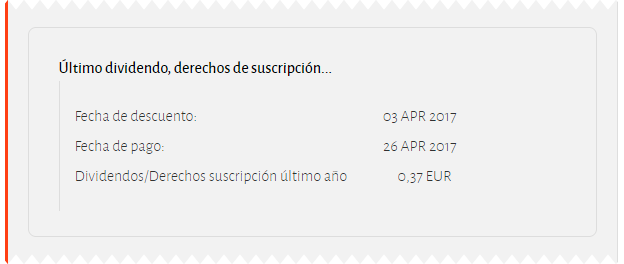 A este respecto debemos advertirle de que la cifra de dividendo no se corresponde al último pagado ni a los que corresponda cobrar en el año en curso, sino al conjunto de los aprobados para pagar con cargo al último año cerrado (los de 2020 si por ejemplo consulta esta opción el 15 de junio de 2021). Esta cuantía bien puede ser pagada de una sola vez o en varios pagos (alguno quizás a cuenta, antes incluso de cerrarse dicho año); así la cifra de dividendo del último año y la del último dividendo cobrado (o a cobrar si todavía no ha realizado su pago) solo coincidirá en caso de que se pague un dividendo único con cargo a ese año.