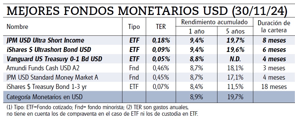 Aunque inviertan en deuda corporativa, no es algo determinante pues lo hacen a plazos cortos donde el riesgo prácticamente se diluye. Además, obtienen unas décimas de rentabilidad de más respecto de la deuda pública estadounidense a muy corto plazo y por tanto superando el rendimiento obtenido por otros monetarios que invierten en deuda pública, y con costes más elevados. Hablamos del Amundi Funds Cash USD A2 (LU0568621618) con unos costes anuales del 0,46%, mermando así la rentabilidad final en torno a un 0,7% menos. Eso sí, al tratarse de un fondo tradicional podría beneficiarse del diferimiento fiscal en los traspasos. Lo encontrará disponible en Singular Bank.