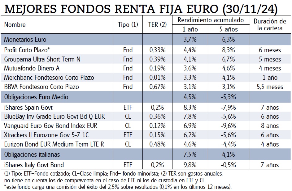 A la hora de apostar por la seguridad y disponibilidad, o simplemente mantener la liquidez, elija un buen fondo monetario en euros. Al invertir en deuda a muy corto plazo, los más rentables suelen cobrar comisiones más ajustadas, de ahí la máxima de optar por aquellos más baratos, con comisiones por debajo del 0,4% anual. Por otro lado, al invertir a plazos cortos el rendimiento esperado se va actualizando conforme la evolución de tipos, y el riesgo del emisor no es determinante, por lo que puede optar por aquellos que dedican buena parte de la cartera a emisores privados para arañar así unas décimas de rentabilidad. Eso sí, sus rendimientos ya no serán tan jugosos como ese algo más del 4% que obtienen los mejores en los últimos 12 meses. El rendimiento esperado en los próximos doce meses estará en torno al 2,5% anual.