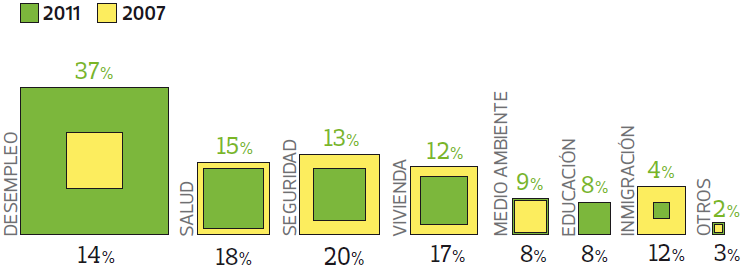 La mayor preocupación de los españoles es el desempleo: así lo señala el 37% de los encuestados por la OCU en 2011, porcentaje que solo era del 14% en la misma encuesta sobre calidad de vida que se hizo desde la OCU en 2007.
