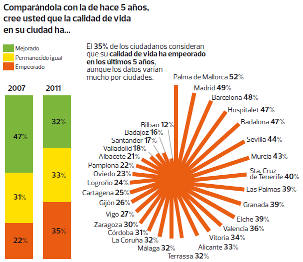 Las diferencias por ciudades son significativas; alrededor del 50% de los habitantes de Palma de Mallorca, Madrid y Barcelona consideran que la calidad de vida empeoró, mientras que en Bilbao únicamente el 12% mantiene está afirmación.
