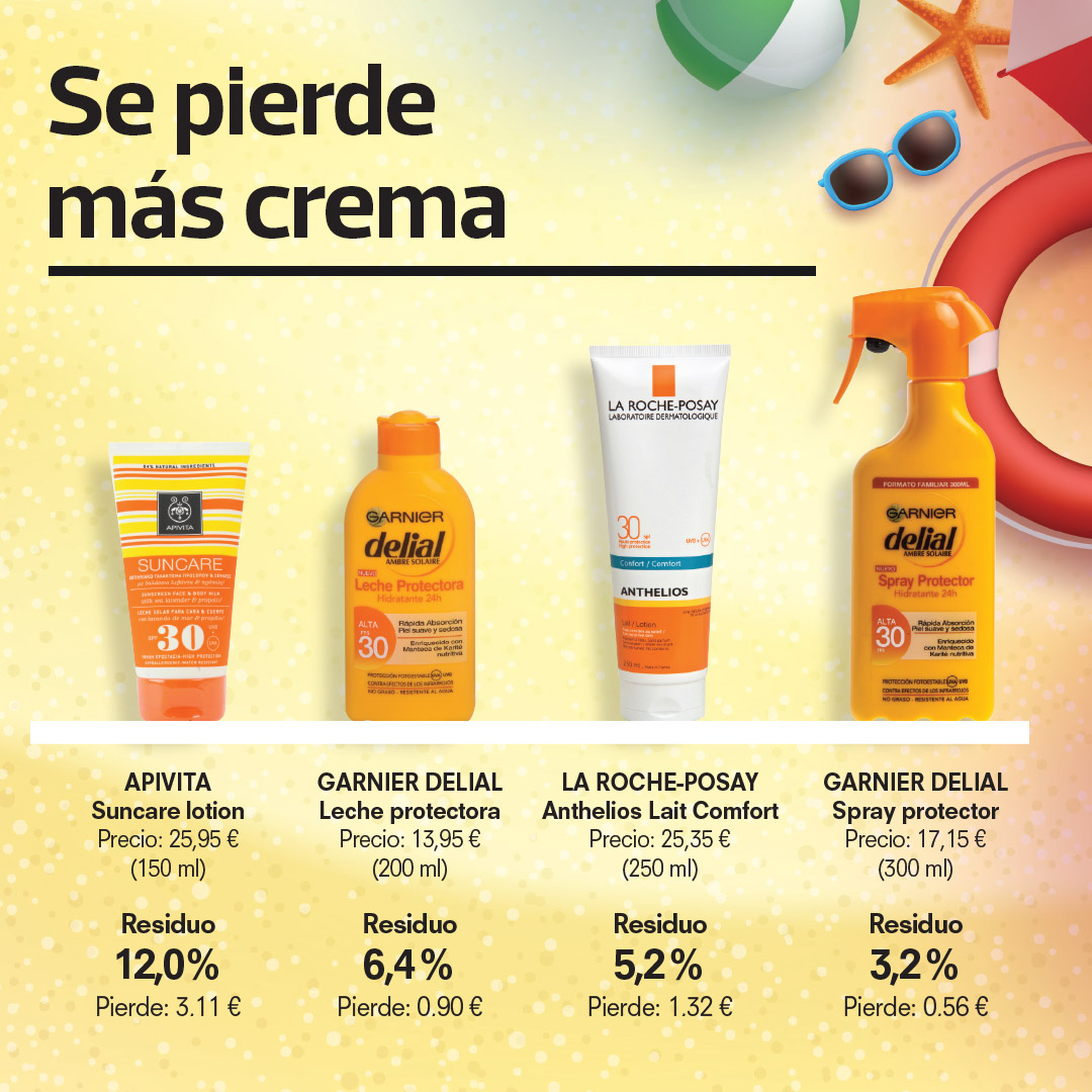 Pero se acaba el bote o al menos "parece que se acaba" y resulta imposible llegar a terminarlo por completo. El tipo de envase propicia que no puedas usar la cantidad residual del final. Por ello hemos querido realizar un análisis para saber cuáles son las marcas y los envases que peor y mejor consiguen que llegues a la última gota. Para ello medimos el contenido residual de crema en los botes de protección solar SPF 30 galardonados en nuestros últimos análisis.