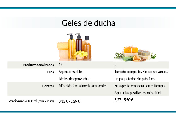 Para la limpieza de la piel del cuerpo encontramos diversos productos: los típicos geles de ducha o baño en versión líquida (13 en nuestro análisis) y los geles o pastillas de ducha en formato sólido (2 en nuestro análisis).