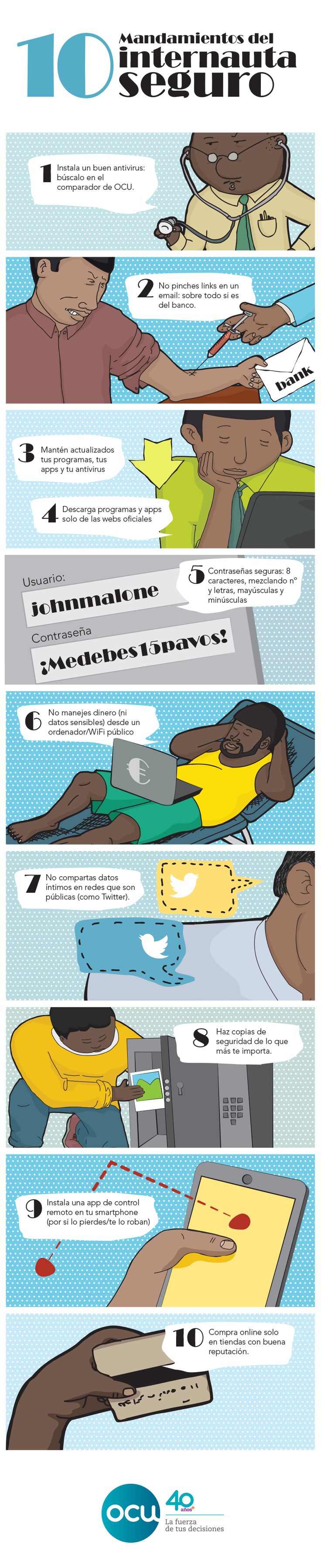 - 6. No compartas tus contraseñas: no se las digas a nadie. Elige una diferente para cada cuenta: mejor si no usas palabras del diccionario y si no son fácilmente deducibles basándose en tu fecha de nacimiento, nombre, ciudad... Ni se te ocurra guardarlas en un documento de texto.