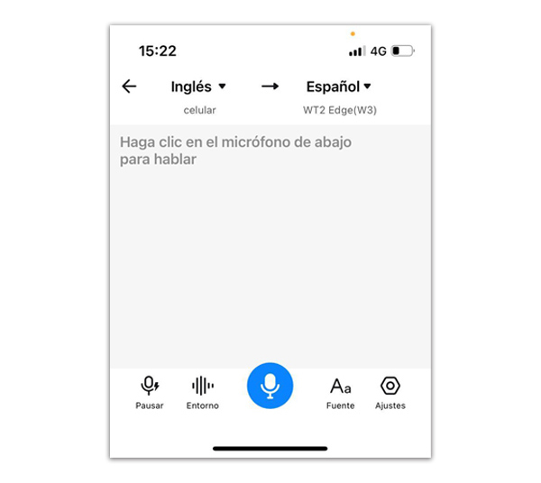 3. Para mantener una conversación, tendrás que hablar siempre manteniendo presionado el auricular hasta que hagas una pausa. Todo lo que hayas hablado se ha transferido a la app, que lo traducirá al inglés y lo leerá de viva voz.
