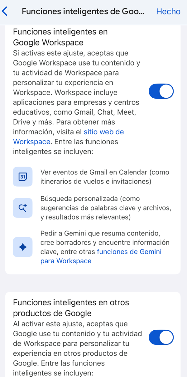 Si además utilizas Google Workspace (una suite de herramientas de productividad y colaboración basada en la nube que integra Gmail, Calendar, Drive, Chat, Meet) u otros productos de Google como Maps, Gemini o Wallet, la IA estará utilizando tu contenido y actividad para personalizar dichas experiencias. Te ponemos algunos ejemplos:
