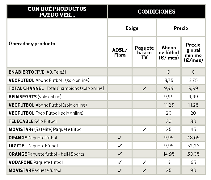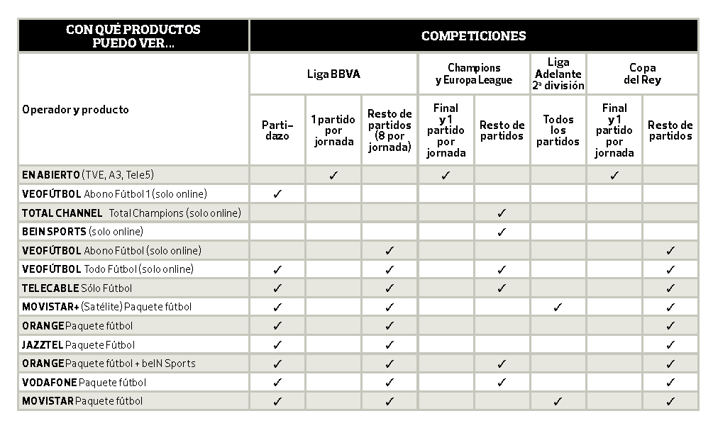 - La Liga: un partido de Primera en abierto cada jornada en TVE, pero que no podrá ser ni del Real Madrid ni del Barcelona ni del Atlético de Madrid ni del Valencia. El resto de partidos serán de pago y se emiten en dos canales: El Partidazo (partido del domingo) y Canal+ Liga (los 8 partidos restantes). La mayoría de las compañías ofrecen estos canales, pero los clientes de Euskaltel (y de la recientemente comprada R) se quedarán sin ellos. En cuanto a la Segunda División, solo podrá verse en Movistar.