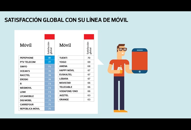 Por países, los españoles (67) somos quienes menos satisfechos estamos con el servicio que ofrece nuestra compañía de telefonía móvil, por detrás de Bélgica (75), Italia (73) y Portugal (69). Puede que seamos más exigentes a la hora de valorar, pero si tenemos en cuenta los resultados totales y las razones que tienen los usuarios para estar más o menos contentos, descubrimos que los españoles tienen motivos para poner una nota baja. Y no es para menos, porque a pesar de las encuestas, algunas compañías no acaban por mejorar el servicio. Es lo que le pasa a Orange, que lleva varios años siendo la compañía peor valorada en nuestro país. En cambio, Pepephone, que presume de no gastar un duro en publicidad, es la mejor valorada.