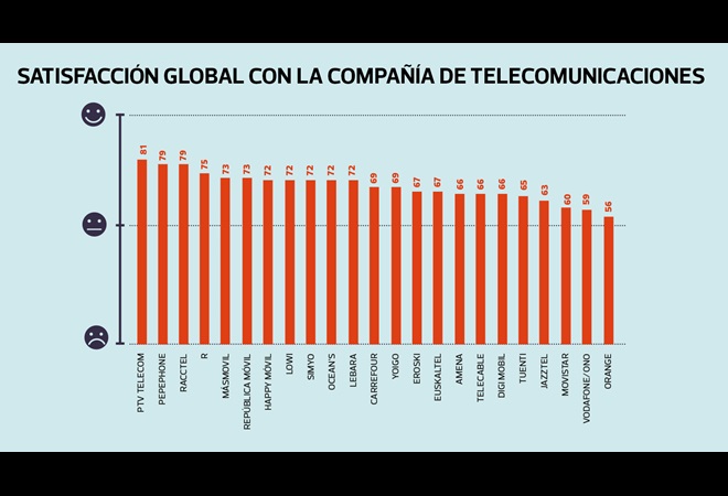 Los resultados a esta pregunta son reveladores. El veredicto que dan los consumidores dictan que PTV Telecom (81), Pepephone (79) y Racctel (79) tienen el beneplácito de sus clientes. Todo lo contrario que las empresas que más invierten en publicidad; Jazztel (63), Movistar (60), Vodafone/ONO (59) y Orange (56) que ocupan los últimos puestos.
