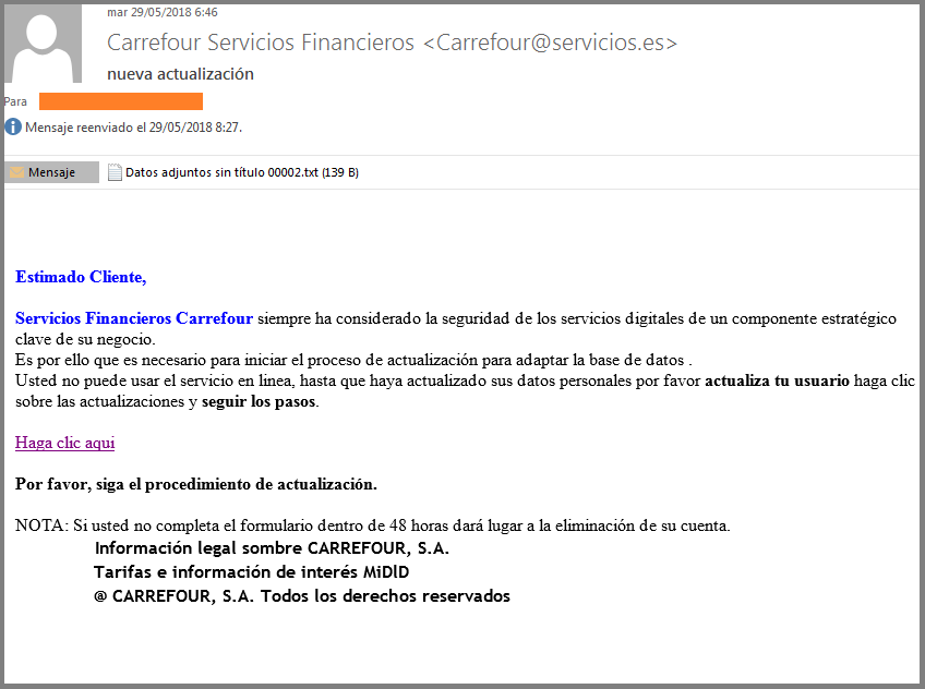 El correo electrónico fraudulento simula provenir de Carrefour Pass bajo el asunto “nueva actualización” o “Carrefour Servicios Financieros”. En el texto te informan de la necesidad de actualizar ciertos datos personales y te piden que hagas clic en el enlace que figura en el email y sigas las instrucciones a la que redirigen y que suplanta a la de Carrefour Pass.