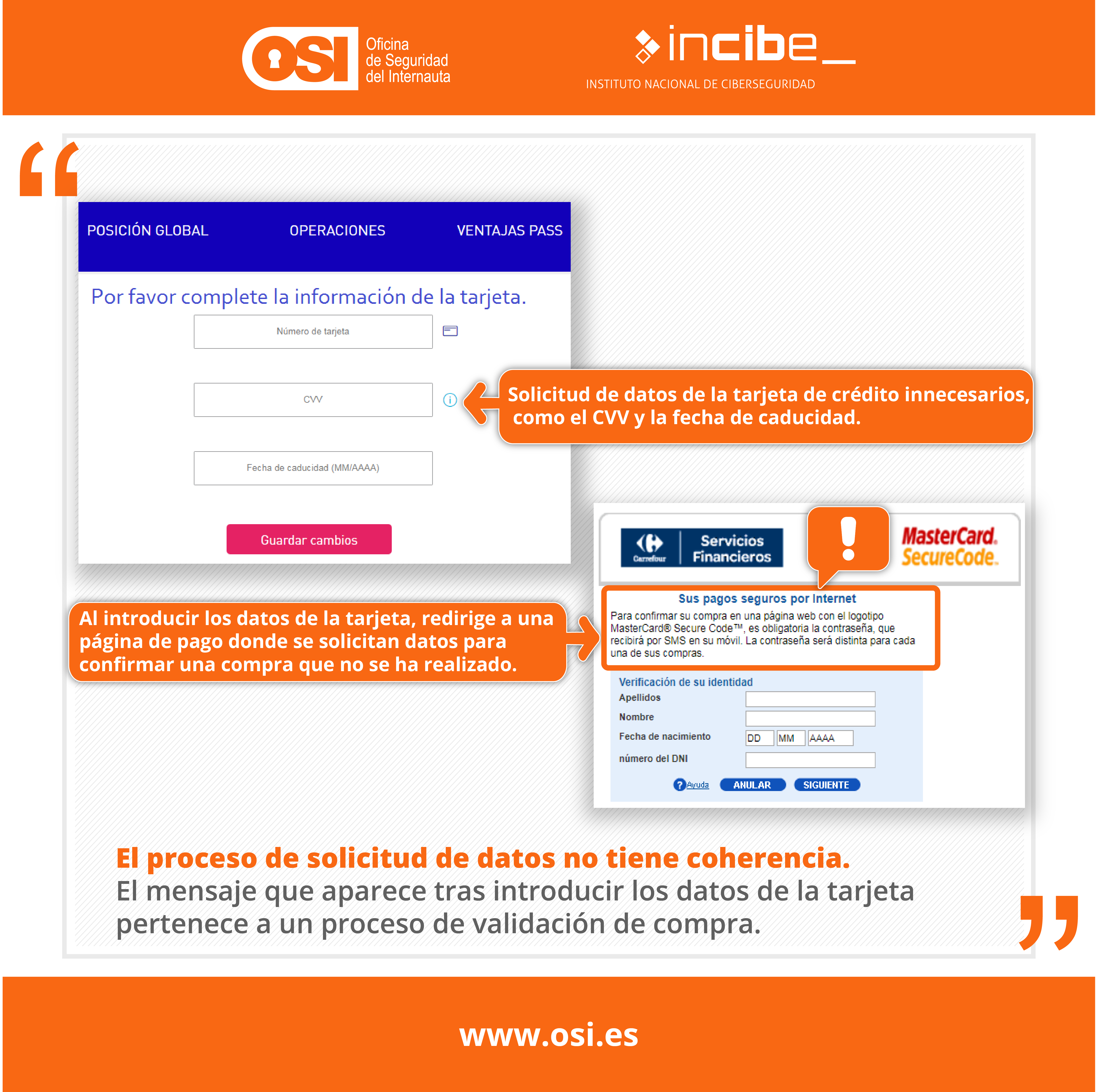 Al seleccionar el enlace “Haga clic aquí” te llevan a otra web que suplanta el servicio de Carrefour Pass. Si rellenas los datos y das al botón “entrar” se cargará una nueva página en la que se solicitan los datos de tu tarjeta de crédito. Número, CVV y caducidad.