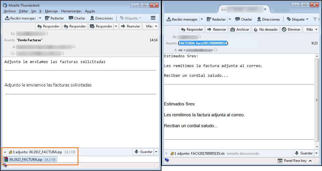 El modus operandi es el siguiente. Se recibe un correo del estilo “Envío de factura: facv201700000014” con un fichero comprimido en formato .zip que contiene una hoja de cálculo o puede que sea solo la hoja de cálculo con nombres como "FACV201700005155.xls". Por supuesto en ambos casos el contenido resutla ser malicioso.