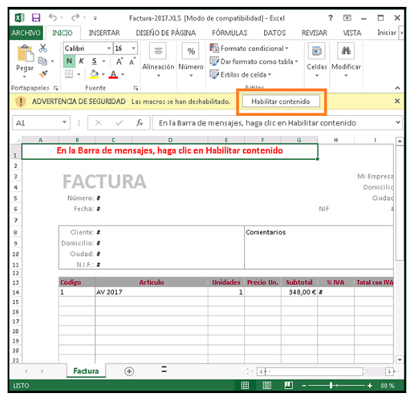 Este fichero contiene una macro (un pequeño programa que puede realizar diferentes acciones de forma automática) y si ejecutas el fichero haciendo clic en «Habilitar contenido», se descargará un virus troyano.