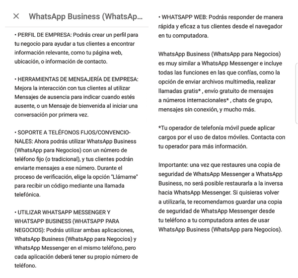 En realidad, este servicio no se diferencia mucho del WhatsApp que ya conocemos en cuanto a su funcionamiento, pero sí te ofrece novedosas posibilidades como la de dar más información relevante como tu página web, tu ubicación o información de contacto como un número de cuenta o un teléfono fijo al que por cierto el cliente podrá escribirte para consultarte o pedirte que le devuelvas la llamada.