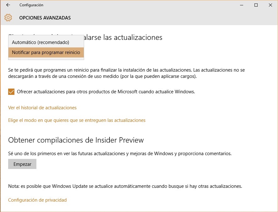 En Opciones Avanzadas desactiva también la instalación automática, escogiendo en el menú desplegable Notificar para programar reinicio.