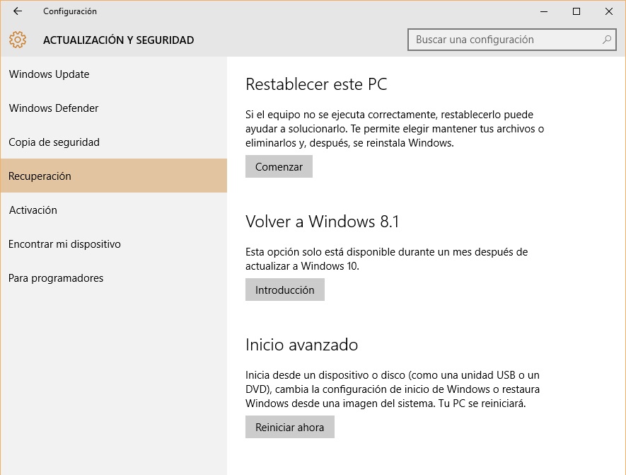 Si por cualquier motivo deseas volver a tu antigua versión de Windows, puede hacerlo en el plazo de un mes desde que se instaló el nuevo Windows 10 a través de la actualización. Para ello, debes acudir a Configuración->Actualización y seguridad->Recuperación y seleccionar la opción para volver a tu sistema operativo anterior (7/8/8.1). Esta opción desaparecerá al expirar los 30 días.