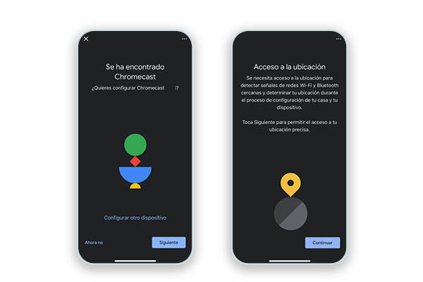 2. Desde la app en el móvil, una vez encuentres tu Chromecast te preguntará si lo quieres configurar, seguidamente, te solicitará el código QR. Una vez que aceptes las políticas de privacidad, te pedirá el acceso a la ubicación y buscará tu red wifi. Finalmente, tendrás que introducir tu cuenta de gmail.