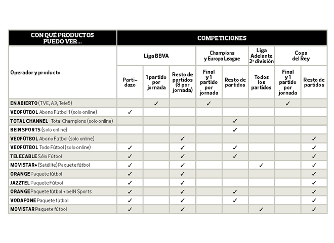 - La Liga: un partido de Primera en abierto cada jornada en TVE, pero que no podrá ser ni del Real Madrid ni del Barcelona ni del Atlético de Madrid ni del Valencia. El resto de partidos serán de pago y se emiten en dos canales: El Partidazo (partido del domingo) y Canal+ Liga (los 8 partidos restantes). La mayoría de las compañías ofrecen estos canales, pero los clientes de Euskaltel (y de la recientemente comprada R) se quedarán sin ellos. En cuanto a la Segunda División, solo podrá verse en Movistar.