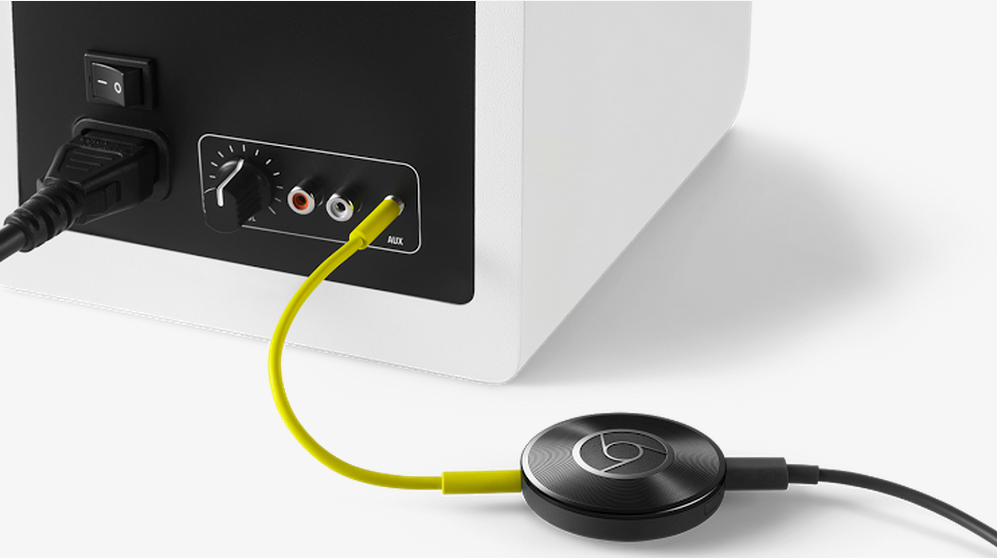 Junto al Chromecast para teles, Google ha presentado una versión para audio: la música de tu smartphone, tablet u ordenador sonará por el altavoz al que enchufes tu Chromecast (mediante su jack de 3,5 mm.).